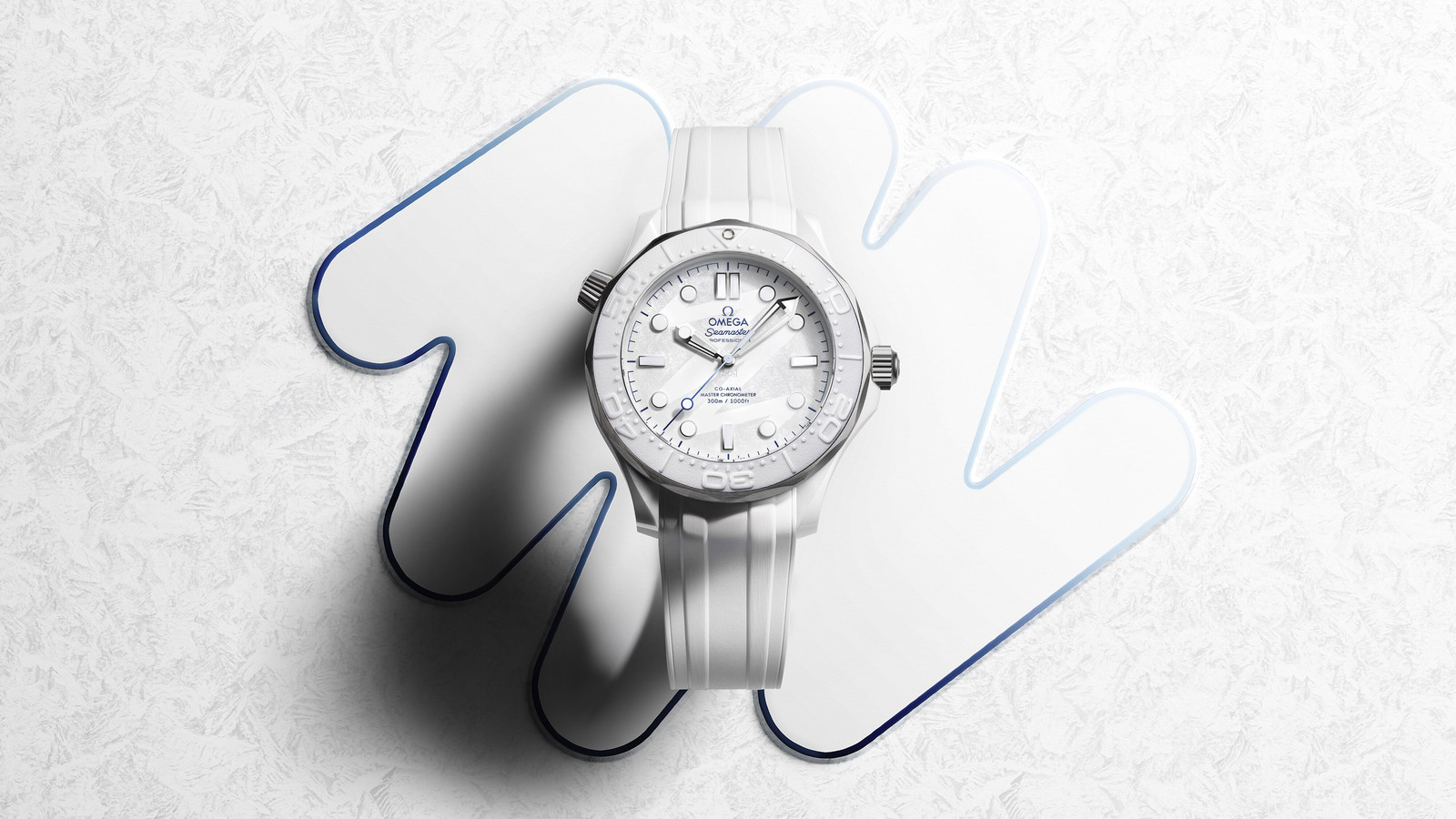 这款43.5毫米腕表采用白色陶瓷和5级钛金属打造,并以特制礼盒承载。腕表配备白色陶瓷表圈,饰有以激光烧蚀技术呈现的浮雕潜水刻度。为了营造冬日氛围,腕表采用白色陶瓷表盘,其上饰有呈现冰霜效果的激光镌刻纹理,以及灵感源自2026年冬奥会会徽“26”字样设计风格的指纹痕迹图案。表盘搭配镀铑指针和小时刻度,覆有白色Super-LumiNova夜光涂层,漆面中央秒针采用浅蓝色渐变设计。