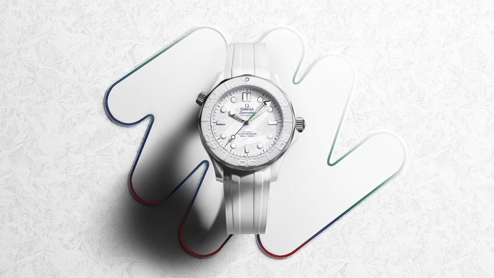 这款43.5毫米腕表采用白色陶瓷和5级钛金属打造,并以特制礼盒承载。腕表配备白色陶瓷表圈,饰有以激光烧蚀技术呈现的浮雕潜水刻度。为了营造冬日氛围,腕表采用白色陶瓷表盘,其上饰有呈现冰霜效果的激光镌刻纹理,以及灵感源自2026年冬奥会会徽“26”字样设计风格的指纹痕迹图案。表盘搭配镀铑指针和小时刻度,覆有白色Super-LumiNova夜光涂层,漆面中央秒针采用红、蓝、绿三色渐变设计。