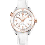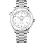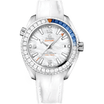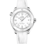 此表款配备耐磨损蓝宝石玻璃表镜,白色陶瓷表盘带有阿拉伯数字时标,3时位置设有日历窗口。39.5毫米精钢表壳配备带有欧米茄Liquidmetal潜水刻度的白色陶瓷单向表圈。